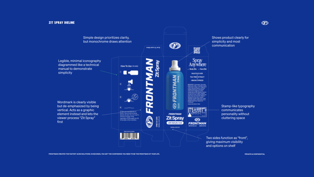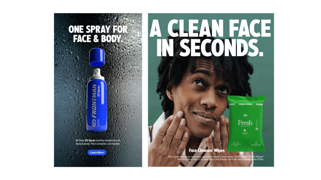 It's mid-2021 which means two things: COVID is taking a much-needed chill-pill and on the other hand Gen Z has turned 18 and is setting fire to the Pre-COVID DTC establishment... it was the perfect time to take a chance on a small-but-mighty acne care company called FRONTMAN. When I joined FRONTMAN it was a relatively new company with a strong manifesto and a single, award(s)-winning product. Together with the founders I helped grow the company into a portfolio of 6+ products complemented by an awesome website, ads, merchandise, landing pages, and more.